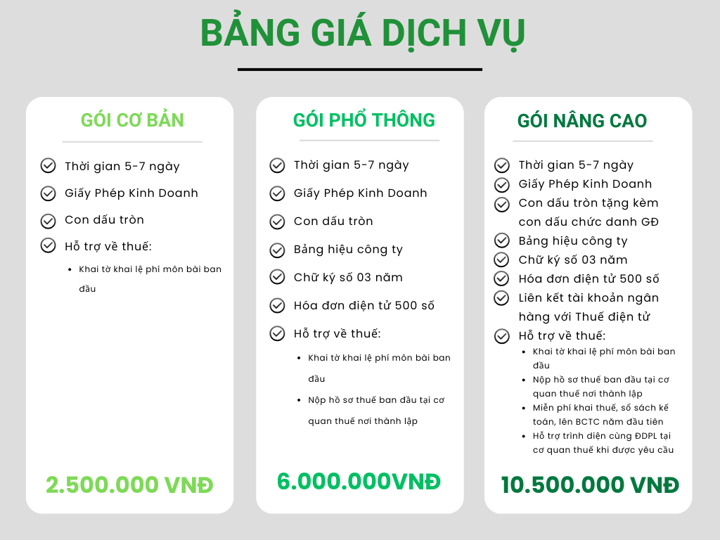 BẢNG GIÁ CÁC GÓI DỊCH VỤ THÀNH LẬP CÔNG TY